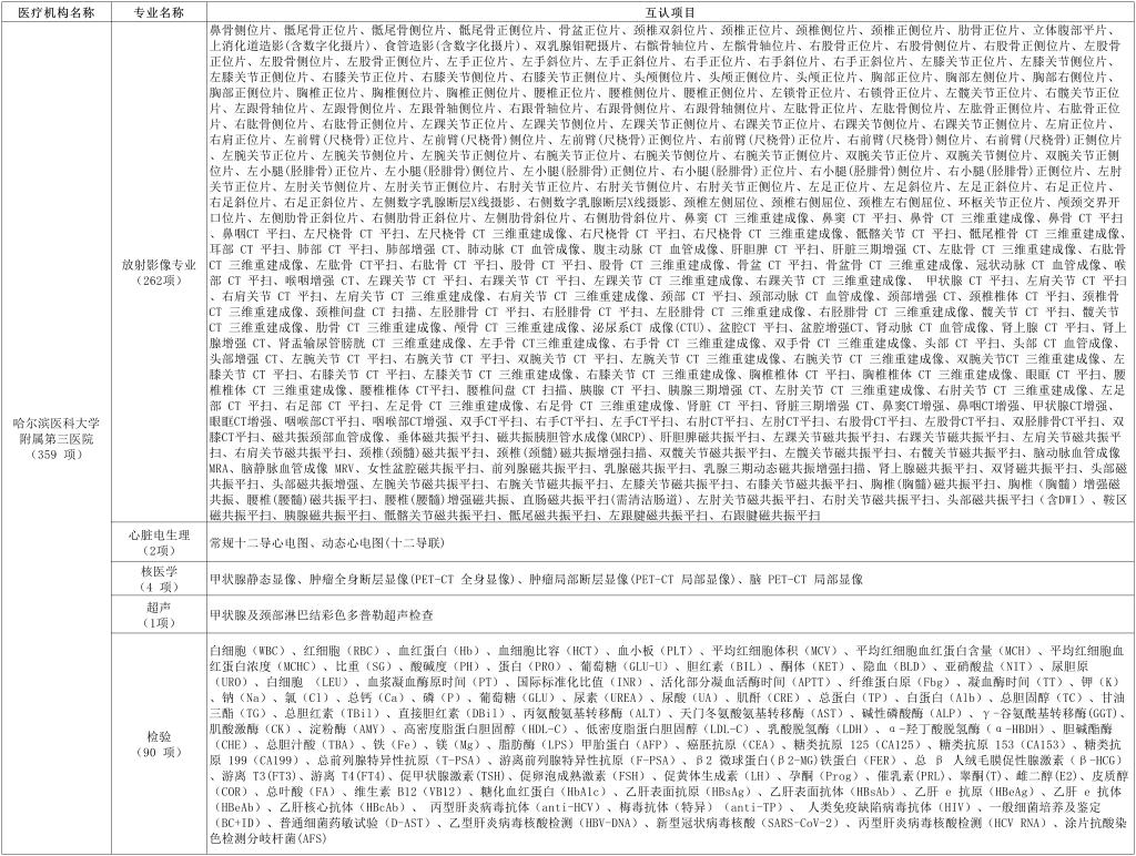 为提高医疗资源利用率,减轻患者就医负担,切实改善患者就医体验,按照《黑龙江省检查检验结果互认动态调整项目公示(第二十二期)》的文件精神,实现我省检查检验结果互认,现公示我院检查检验结果在其他三甲医院予以互认项目(第三版),较第二版新增33项检验项目。