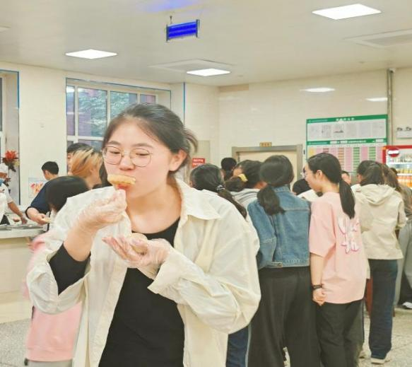 当一个个带着美好祝福的月饼在手中诞生时,每名同学的脸上都洋溢着自豪与喜悦,这不仅是劳动的乐趣,更是一份浓浓的家国情怀。随着“叮”的一声,热气腾腾的月饼新鲜出炉,金黄的外皮泛着诱人的光泽,轻轻掰开,五仁的颗粒感与枣泥的绵密感瞬间释放,咬下一口,酥软香甜的滋味在舌尖蔓延,同学们纷纷拿起手机记录这幸福的时刻,分享着亲手制作的喜悦。