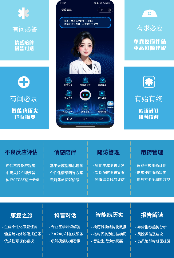 管理革新,多维数据助精准医疗。患者登录后可在“智能病历夹”查看就诊记录、检查报告,系统提取关键信息生成治疗摘要;对关节痛、潮热等不良反应,按国际标准分级,高级别反应提醒医生介入,实现“早发现、早干预”。