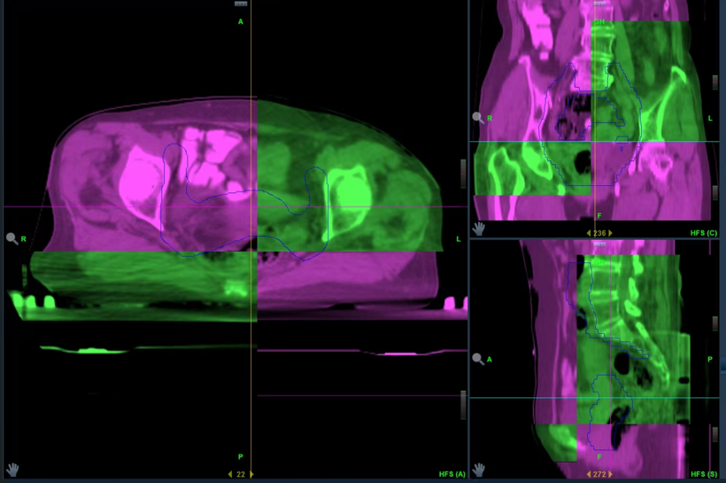 宫颈癌患者王某在TomoC平台接受放疗时,KVCT图像与模拟定位CT的配准结果显示靶区位移明显(图2所示)。经医疗团队分析,该偏差源于治疗前直肠充盈状态与定位时存在差异。医疗团队随即指导患者完全排空直肠后,再次进行KVCT扫描验证,确认靶区位置与初始定位CT完全重合后,实施精准照射,保障治疗效果。