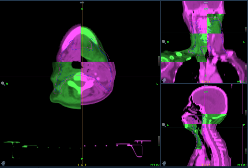 鼻咽癌患者李某因躯体疼痛,在放射治疗摆位时依从性较差,摆位误差多次超出临床可接受范围。若采用传统放疗方案,不仅可能导致治疗失败,还可能引发严重放射性损伤。借助TomoC的KVCT图像引导验证功能(图1),医疗团队在每次治疗前通过实时扫描纠正摆位偏差,最终实现毫米级精准定位,确保全程治疗顺利推进,目前李某的肿瘤病灶得到有效控制。