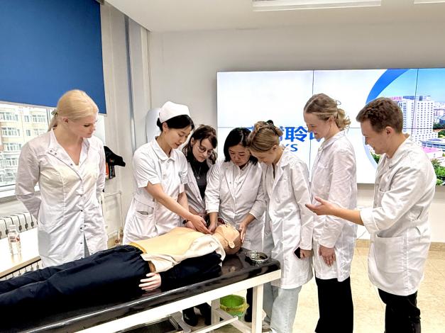 俄方代表团对医院图书馆丰富的电子资源储备与高效的知识检索系统给予高度评价,认为其为护理科研与持续学习提供了坚实支撑;职工之家的人文设计与关怀理念,让俄方成员深切感受到医院对医护人员身心健康的重视,引发对医护职业幸福感建设的共鸣。健康管理中心打造的“一站式”肿瘤早筛流程,凭借高效、精准的服务模式给代表团留下深刻印象,双方围绕肿瘤预防关口前移、健康管理体系构建等话题展开热烈探讨。在临床技能实验教学中心,俄方学生积极参与心肺复苏(CPR)操作演练,在实操中交流急救护理技术要点,现场学习氛围浓厚。