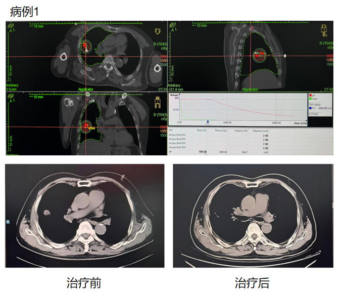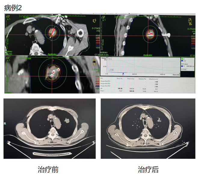 病例1、病例2为两名经标准综合治疗后复发的肺癌患者,因年龄较大,不能行全身治疗,经与患者及家属沟通,行近距离立体定向治疗。治疗中,两名患者在行插植针穿刺及放疗过程中无任何不适主诉;治疗后,患者自行返回病房,当天即办理出院安返家中,期间无任何不适;两月后,患者返院复查,与治疗前肿瘤进行对比,显示肿瘤明显缩小甚至消失。