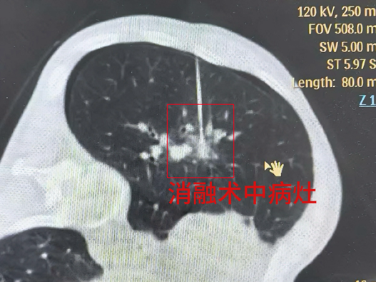 在麻醉团队的全力保障下,陶冀教授团队凭借丰富的临床经验和精湛的技术,采取左侧卧位,运用单针精准分段穿刺技术,如同一位技艺高超的工匠,将消融针尖精准无误地置入病灶核心。术中,他们以30—40W的中低功率进行消融,持续9分钟后,谨慎退针并补充消融,通过两个精心设计的消融循环,确保消融范围完全覆盖病灶,实现肿瘤的彻底灭活。手术过程顺利,术中无出血,仅出现少量气胸,经置管抽气后迅速缓解,重要血管与支气管均得到妥善保护。