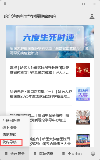 通过“哈尔滨医科大学附属肿瘤医院”官方微信公众号,点击底部菜单“诊疗服务”—“院内导航”,并开启手机蓝牙和定位,系统将自动定位。