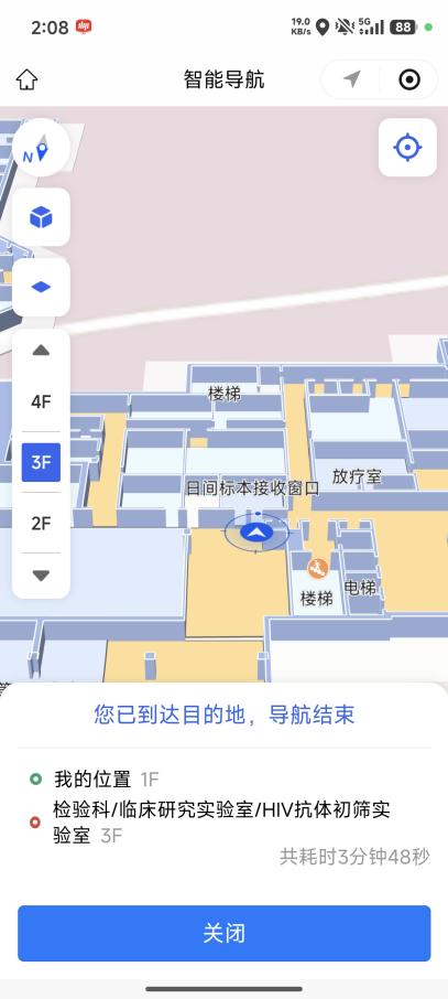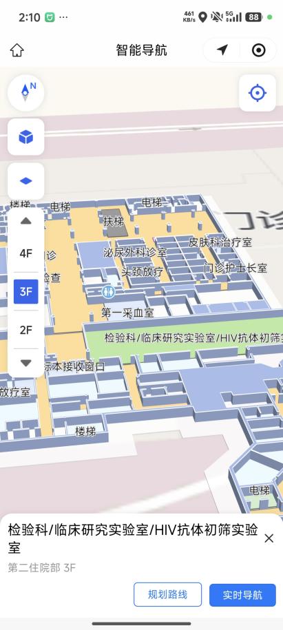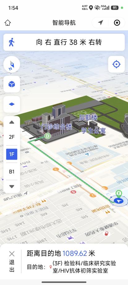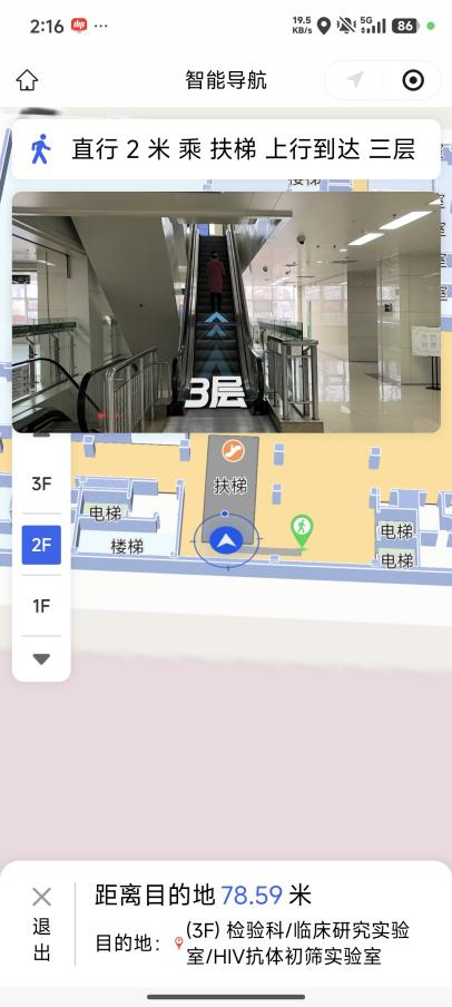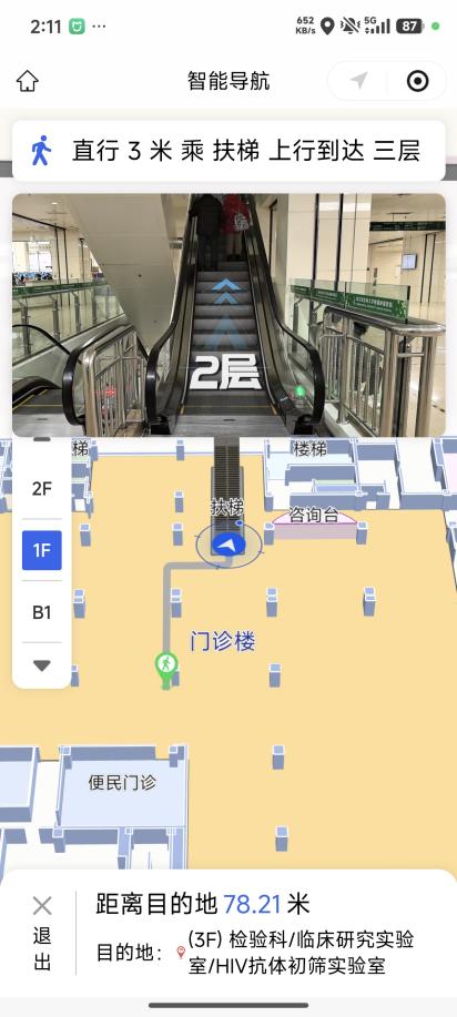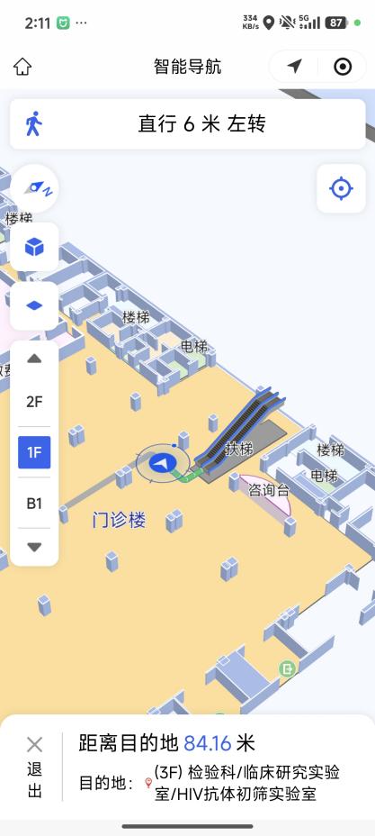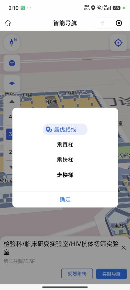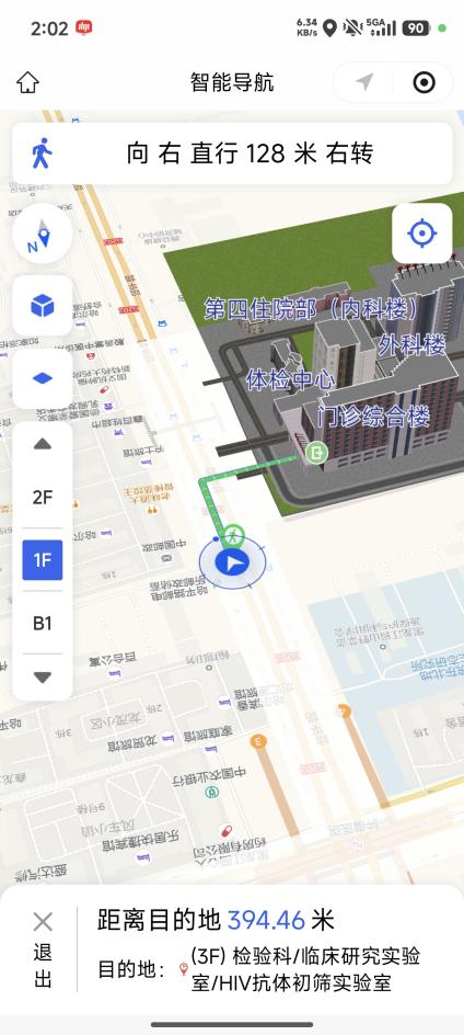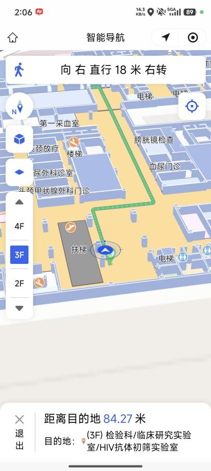 从门诊综合楼到放疗楼,从一楼到五楼,系统都能自动规划包含电梯、楼梯在内的完整路线。跨楼层导航不再有“断层”,走到哪,指引就跟到哪。