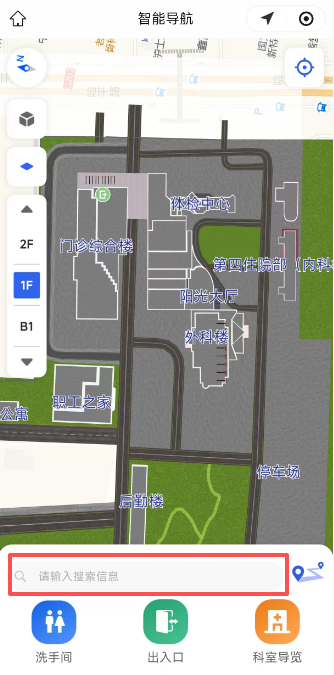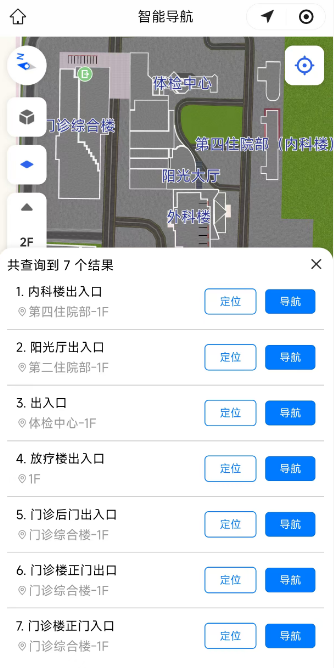 无论在室外还是室内,系统都能实现从室外地图到院内蓝牙定位的自动切换。进楼前怎么走,进楼后继续怎么走,一次导航带您到底,不用反复问路、反复搜索。