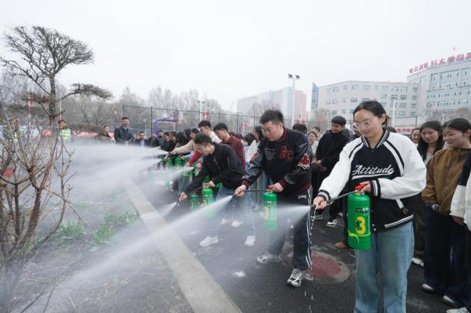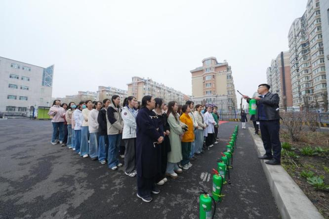 疏散环节结束后,保卫科工作人员现场讲解并示范水基型灭火器的使用方法和操作要领,强调“提、拔、握、压”的动作规范和保持安全距离等注意事项。学生在专人指导下分组进行灭火器实操演练,加深对初期火灾扑救要点的理解。随后,保卫科工作人员对此次演练过程进行简要点评,同时提醒大家务必将演练视为实战,时刻保持防火警觉。