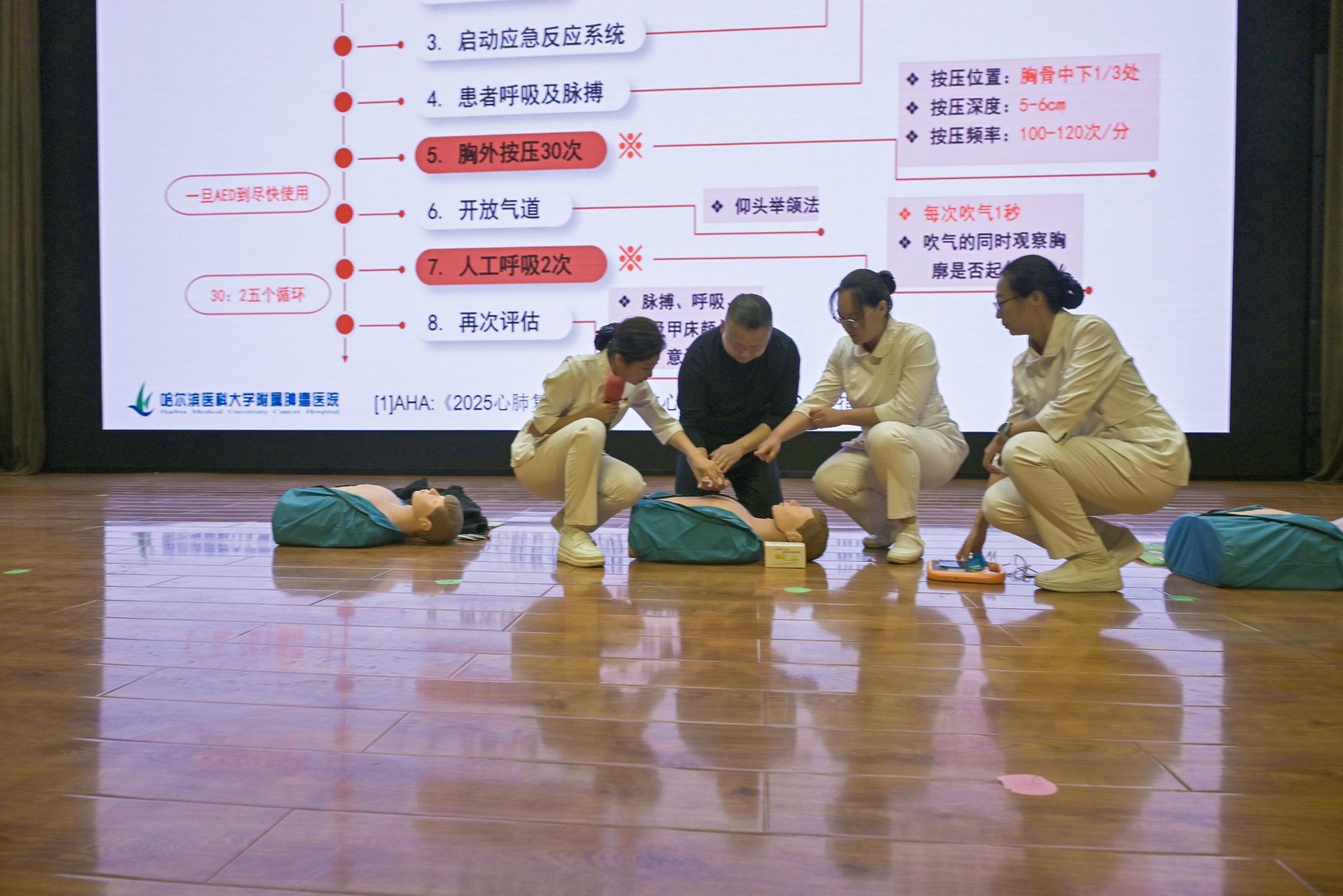 本次讲座由国家级肿瘤专科护士、哈医大肿瘤医院副主任护师赵敬先担任主讲,王静、宋冰冰、吴日娜、邹媛4名国家专科护士全程提供实操指导,采用“理论讲座+现场实操”相结合模式,为师生带来一场实用性极强的急救知识培训。