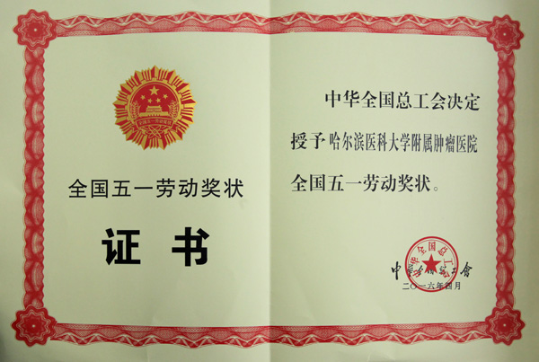 中华总工会授予哈医大肿瘤医院全国五一劳动奖状证书